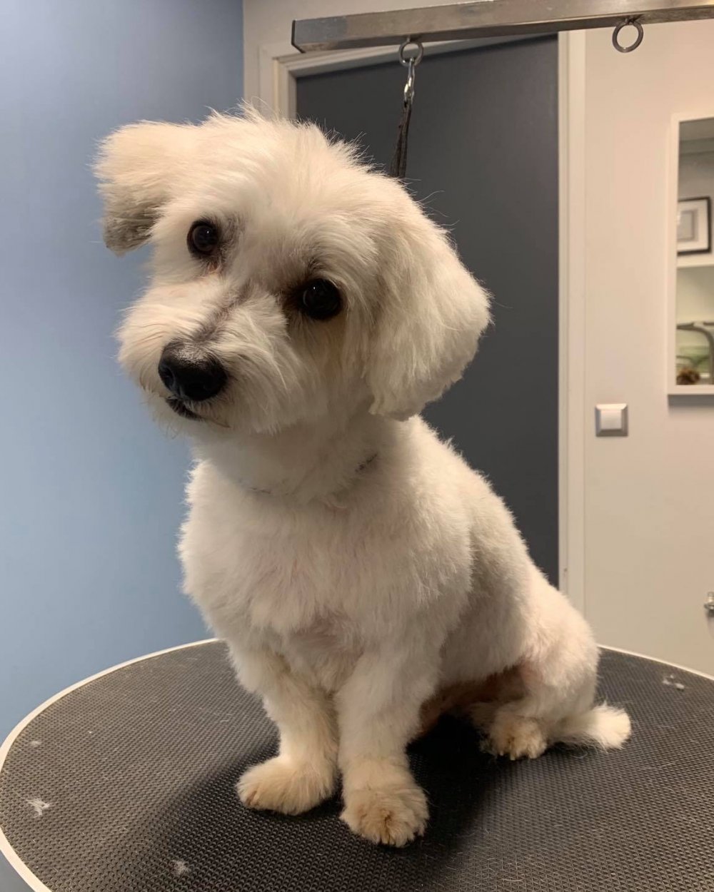 Perusteellinen pesu, trimmaus asiakkaan toiveiden mukaisesti, kynnet ja korvakarvat.